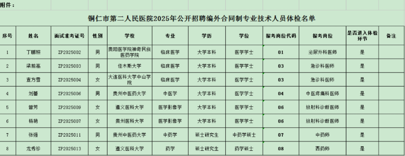 铜仁市第二人民医院2025年公开招聘编外合同制专业技术人员体检公告