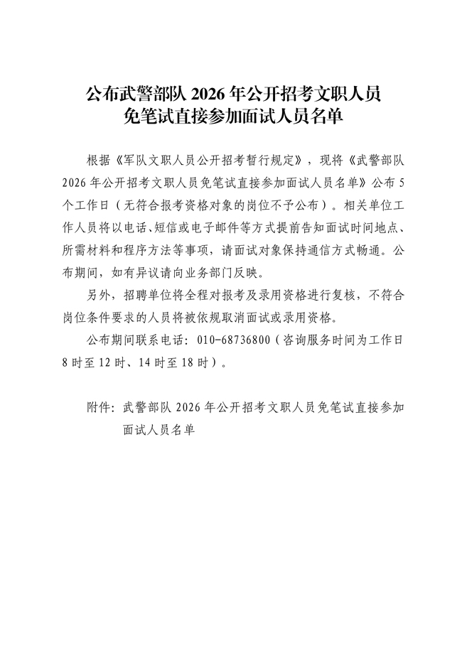 公布武警部队2026年公开招考文职人员 免笔试直接参加面试人员名单