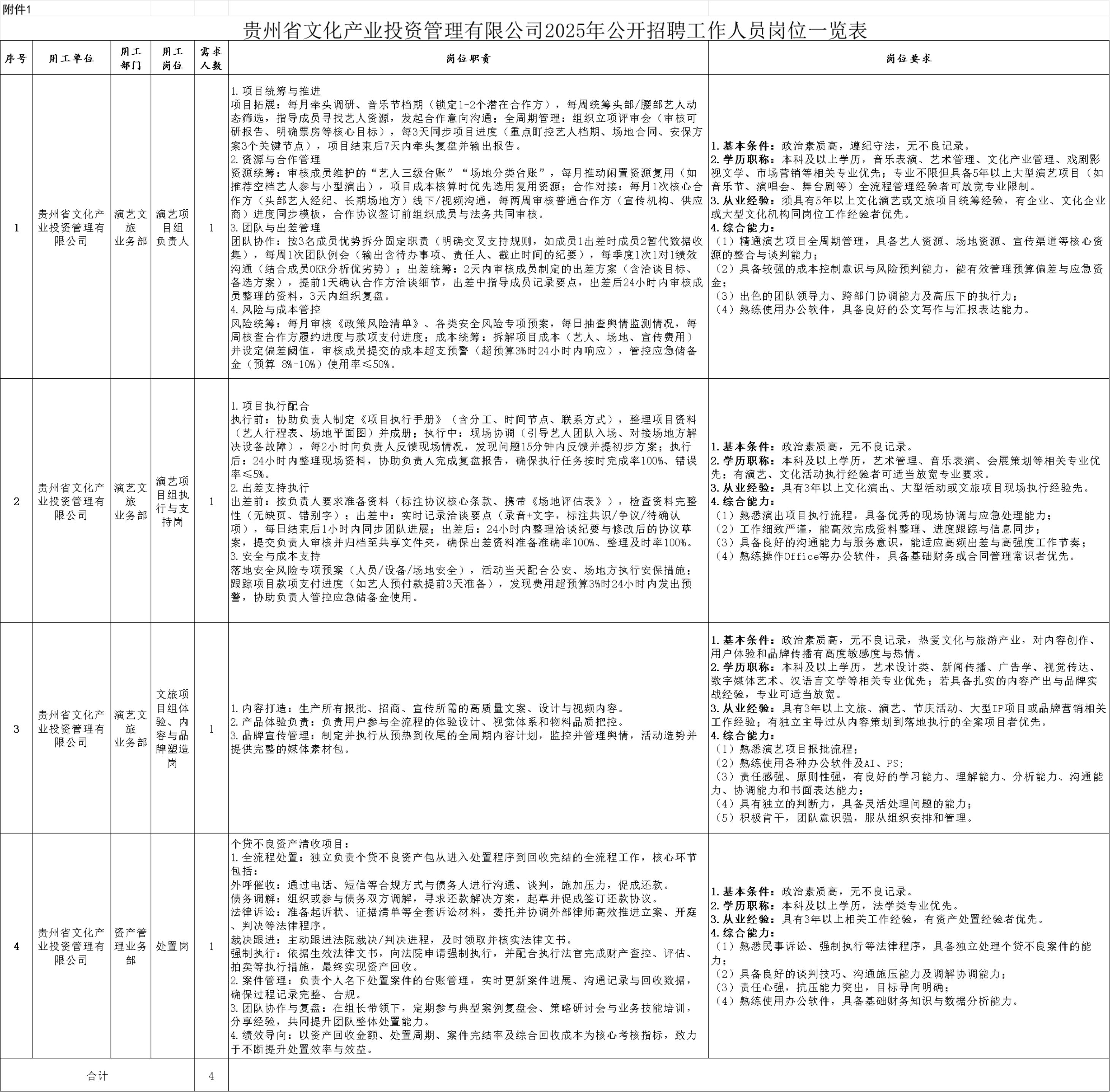 本次共招聘工作人员3名,劳务人员1名,具体岗位名称、职责要求、资格条件等详见《贵州省文化产业投资管理有限公司2025年公开招聘工作人员岗位一览表》(附件1)。