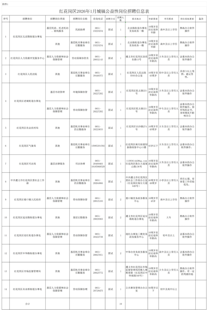 本月14家用人单位拟招聘城镇公益性岗位人员共计19名,具体招聘单位及岗位要求详见《红花岗区2026年1月城镇公益性岗位招聘信息表》。