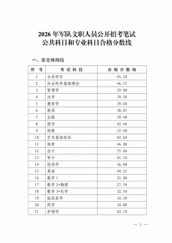 2026年军队文职人员公开招考笔试 公共科目和专业科目合格分数线
