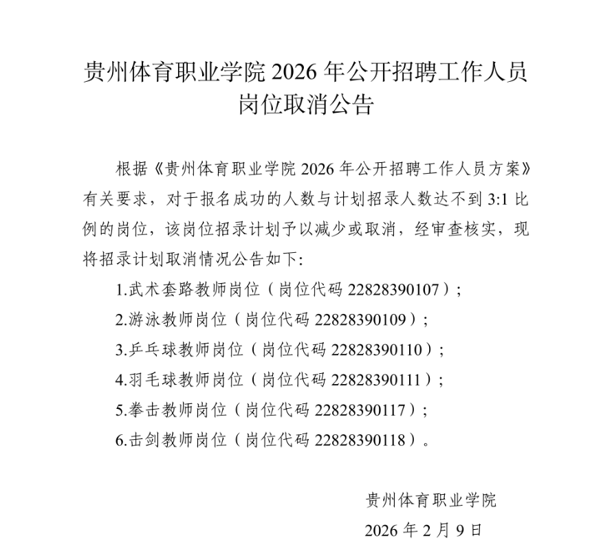 贵州体育职业学院2026年公开招聘工作人员岗位取消公告