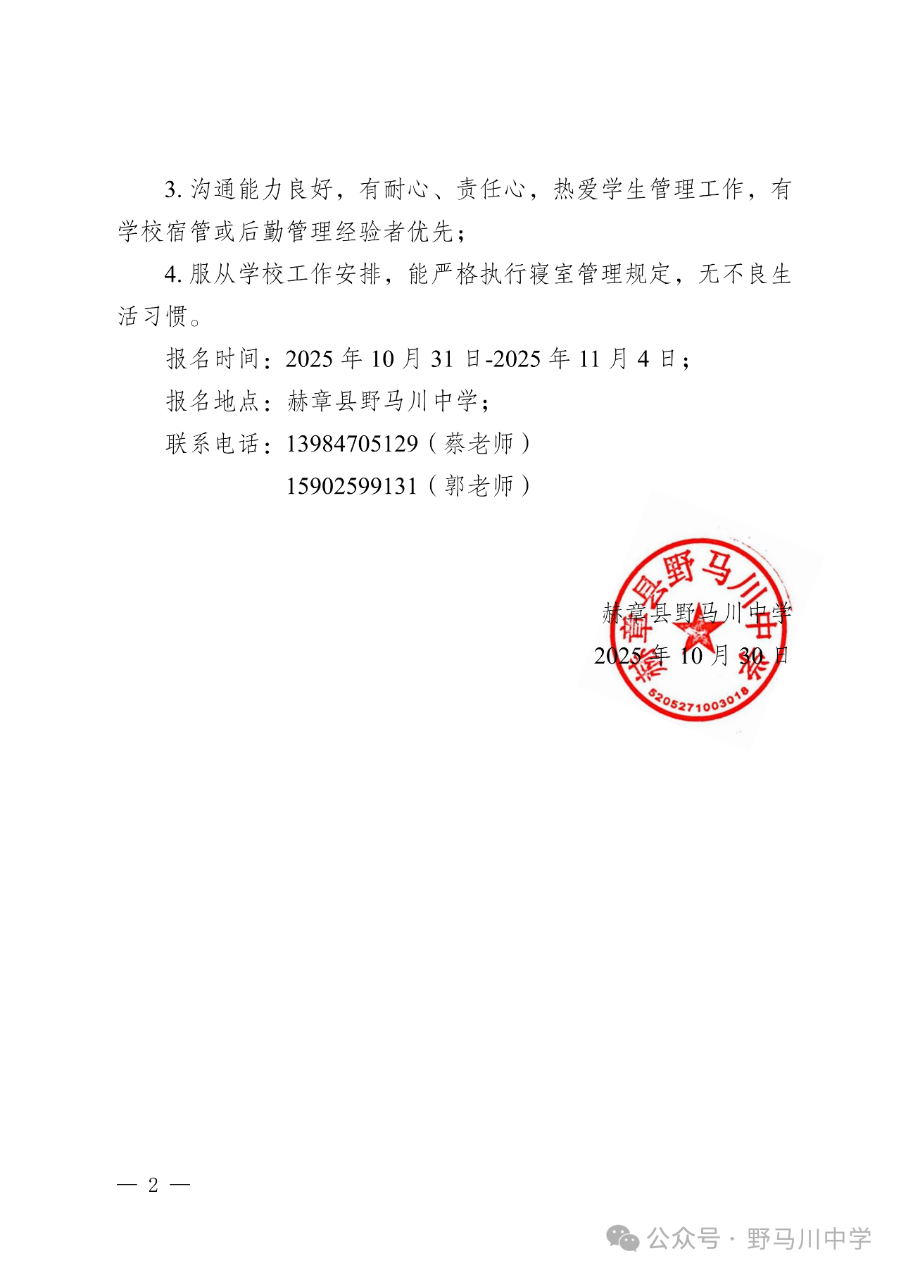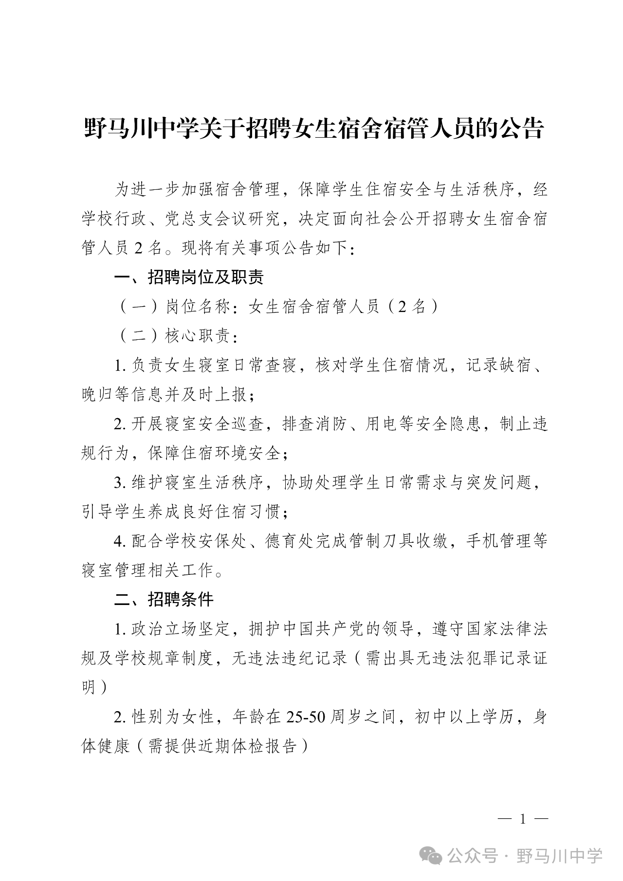 赫章县野马川中学关于招聘女生寝室宿管人员的公告