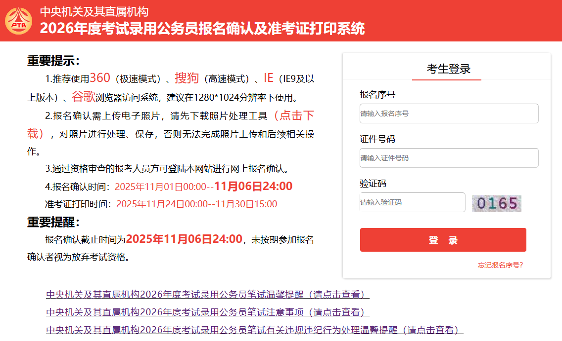 【准考证打印】2026年度考试录用公务员报名确认及准考证打印系统入口