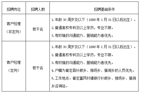 普定富民村镇银行是浙江温州鹿城农村商业银行在各级政府和监管部门的支持下发起设立的股份制地方性金融机构。自成立以来,始终秉持“立足县域、服务‘三农’”的经营理念和“做小、做广、做精”的经营定位,致力于为地方小微企业、个体工商户和“三农”经济发展提供优质、高效、便捷的金融服务,为助推地方经济发展和乡村振兴建设做出了积极贡献,先后荣获“全国支农支小优秀村镇银行”“全国村镇银行强农实力百强”“十佳突出贡献企业”等多项荣誉。现因业务发展需要,特向社会公开招聘,一经录用,将提供广阔的发展空间及当地富有竞争力的薪酬福利待遇。