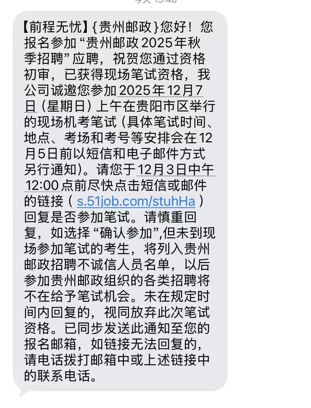您好!您报名参加“贵州邮政2025年秋季招聘”应聘,祝贺您通过资格初审,已获得现场笔试资格,我公司诚邀您参加2025年12月7日(星期日)上午在贵阳市区举行的现场机考笔试(具体笔试时间、地点、考场和考号等安排会在12月5日前以短信和电子邮件方式另行通知)。请您于12月3日中午12:00点前尽快点击短信或邮件的链接()回复是否参加笔试。请慎重回复,如选择“确认参加”但未到现场参加笔试的考生,将列入贵州邮政招聘不诚信人员名单,以后参加贵州邮政组织的各类招聘将不在给予笔试机会。未在规定时间内回复的,视同放弃此次笔试资格。已同步发送此通知至您的报名邮箱,如链接无法回复的,请电话拨打邮箱中或上述链接中的联系电话。