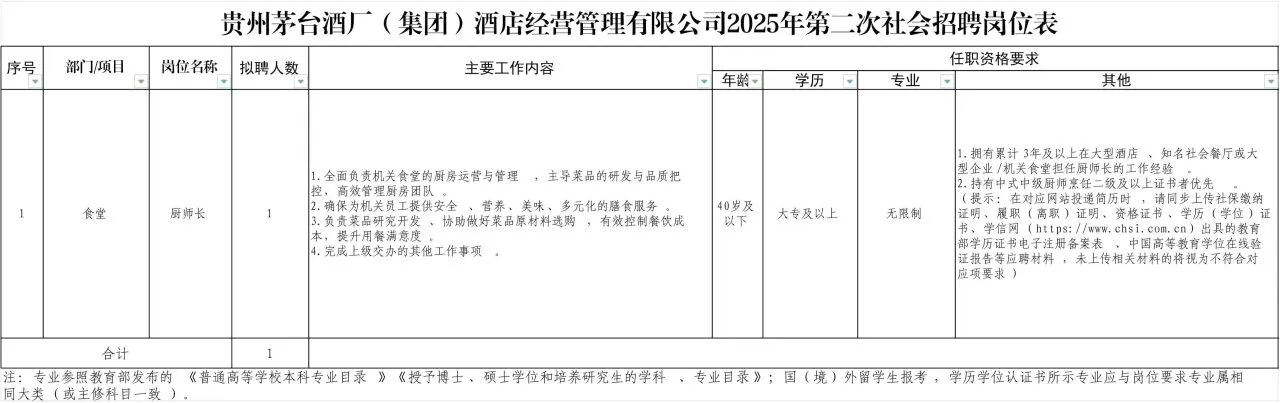 贵州茅台酒厂(集团)酒店经营管理有限公司(下称“公司”)于2017年5月19日经国资委批复成立,是由中国贵州茅台酒厂(集团)有限责任公司出资设立的法人独资公司。公司主要从事酒店经营管理与咨询、物业管理、企业形象策划、会议及展览服务、餐饮服务等相关业务,总部设在贵州省遵义市茅台镇。公司配备优秀的酒店管理团队,坚持“以客为尊、质量第一”的经营理念和“以人为本、科学管理”的发展宗旨,努力将公司打造成为具有中国独有风格与品位的全国知名、国内一流的连锁酒店管理品牌。公司目前受委托管理茅台国际大酒店、三亚海棠湾茅台度假村、醉园宾馆等项目,并向茅台集团会议中心及办公大楼提供会议、内勤服务。 因业务发展需要,经研究,公司决定面向社会公开招聘食堂厨师长1名。 一、招聘岗位 本次招聘岗位的工作地点在贵州省遵义市仁怀市茅台镇。具体招聘岗位及条件如下:  |